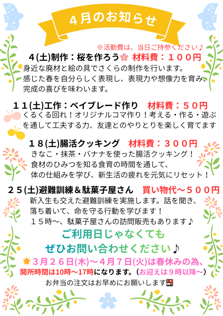 新学期がスタートし、新しい環境や生活リズムに変化が出る時期となりました。