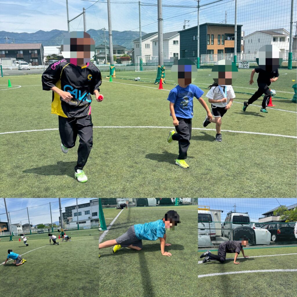 その後は、リレーや動物歩きといった運動メニューに取り組みました。動物歩きでは自分の頭のイメージと体の動きがついて来ず転ぶ子もチラホラ、、、それもチャレンジしているからこその経験ですね!!